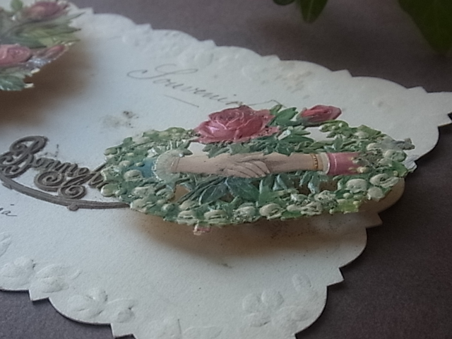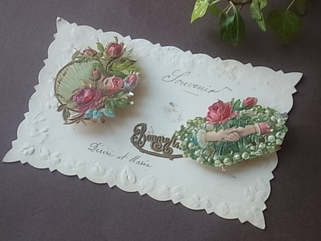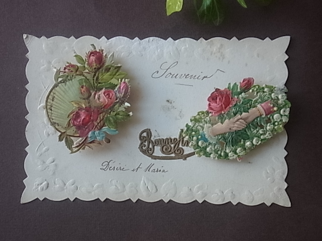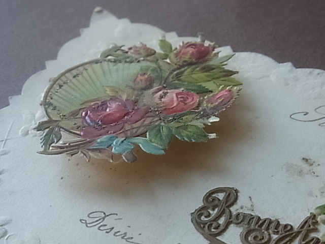 | 飛び出す絵本みたいに、立体的になってます。 印刷もエンボスです。 薔薇の後ろが、日本の団扇?なのが、この時代に流行りだった東洋趣味を伝えています。 |
