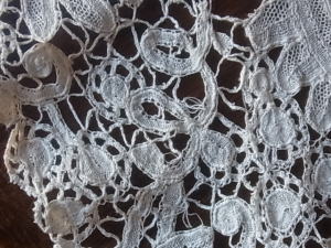 | ボビンレース(ホ二トンレース)の上にニードルワークのポワントローズが施された、ミックス技法。 ふわりと、柔らかくしなやかです。 |