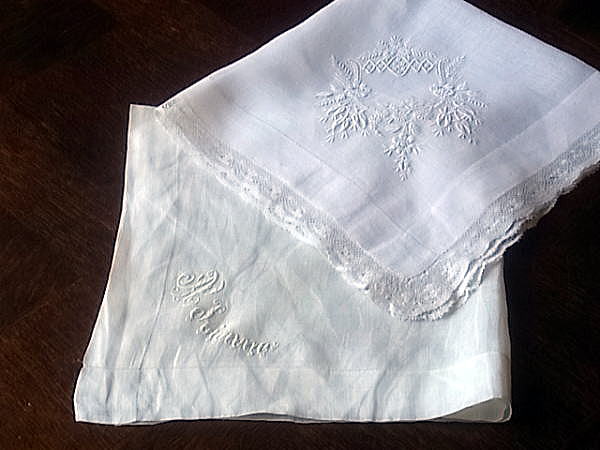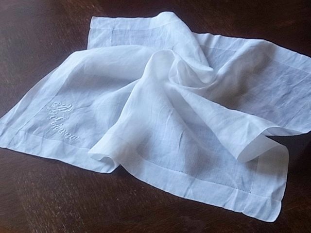 | 19世紀末期〜20世紀初頭にかけての、リネン地に白刺繍のハンカチです。 A.Soienneの、持ち主のお名前の、エレガントな花文字の刺繍。 |
