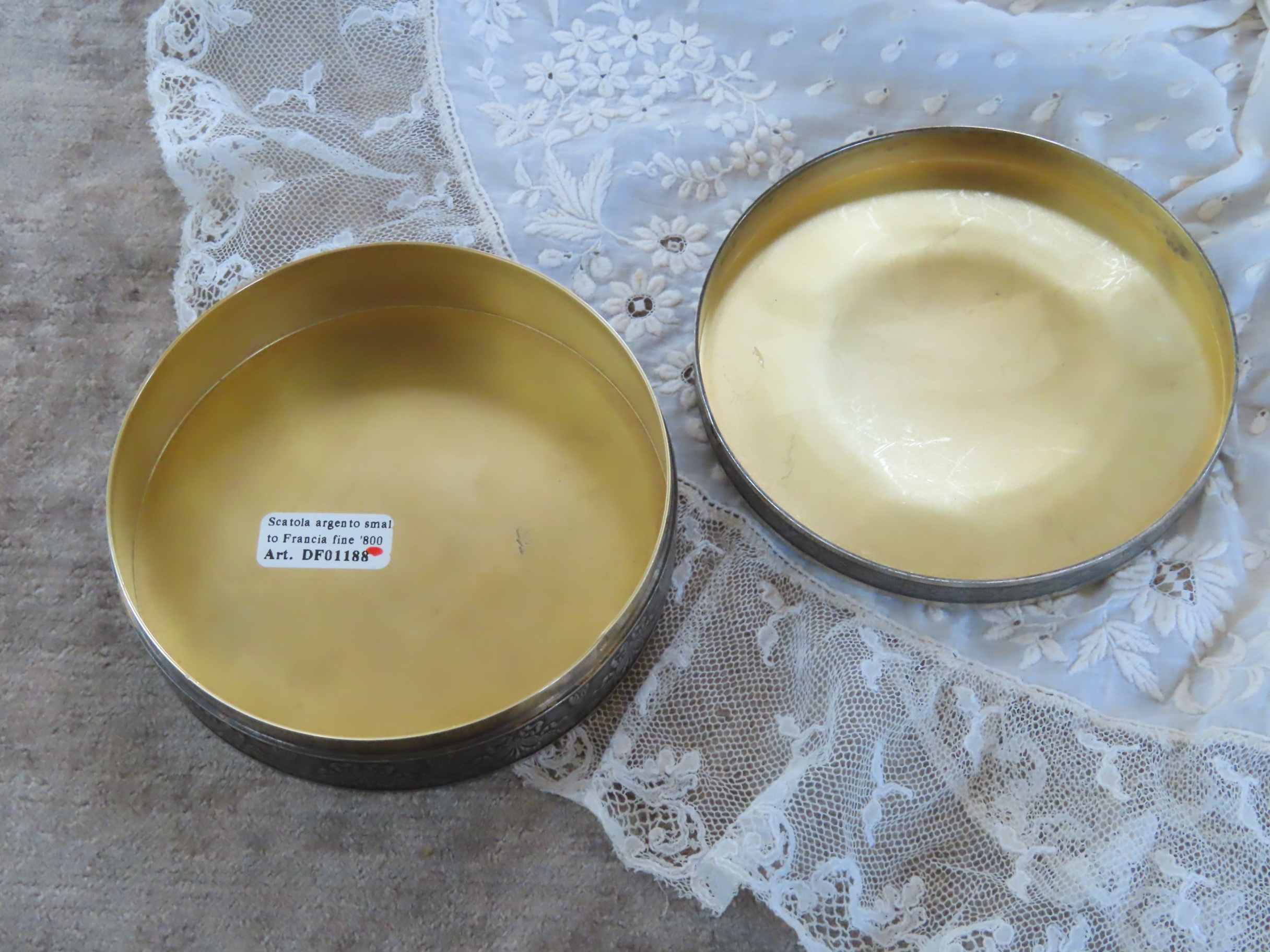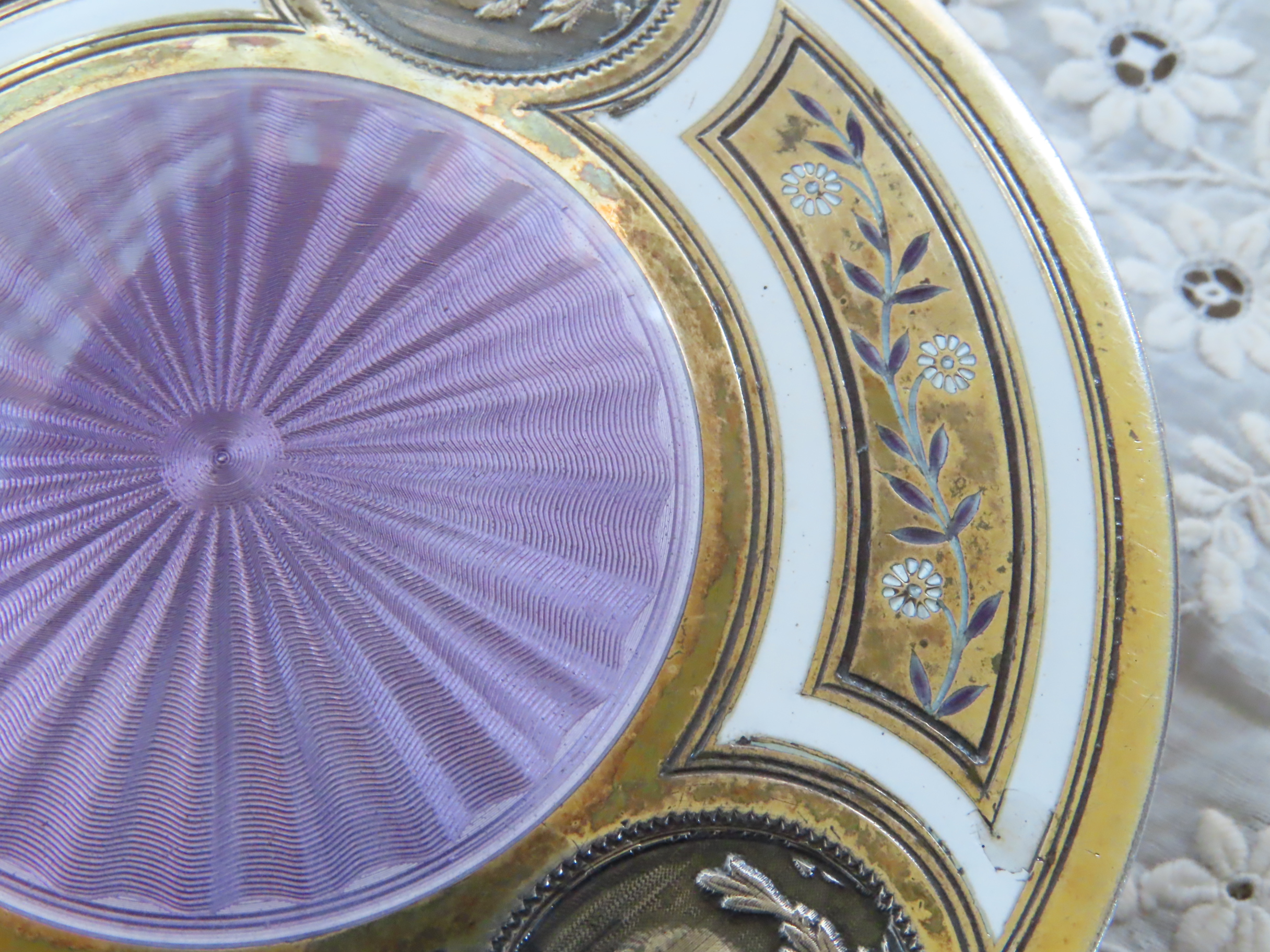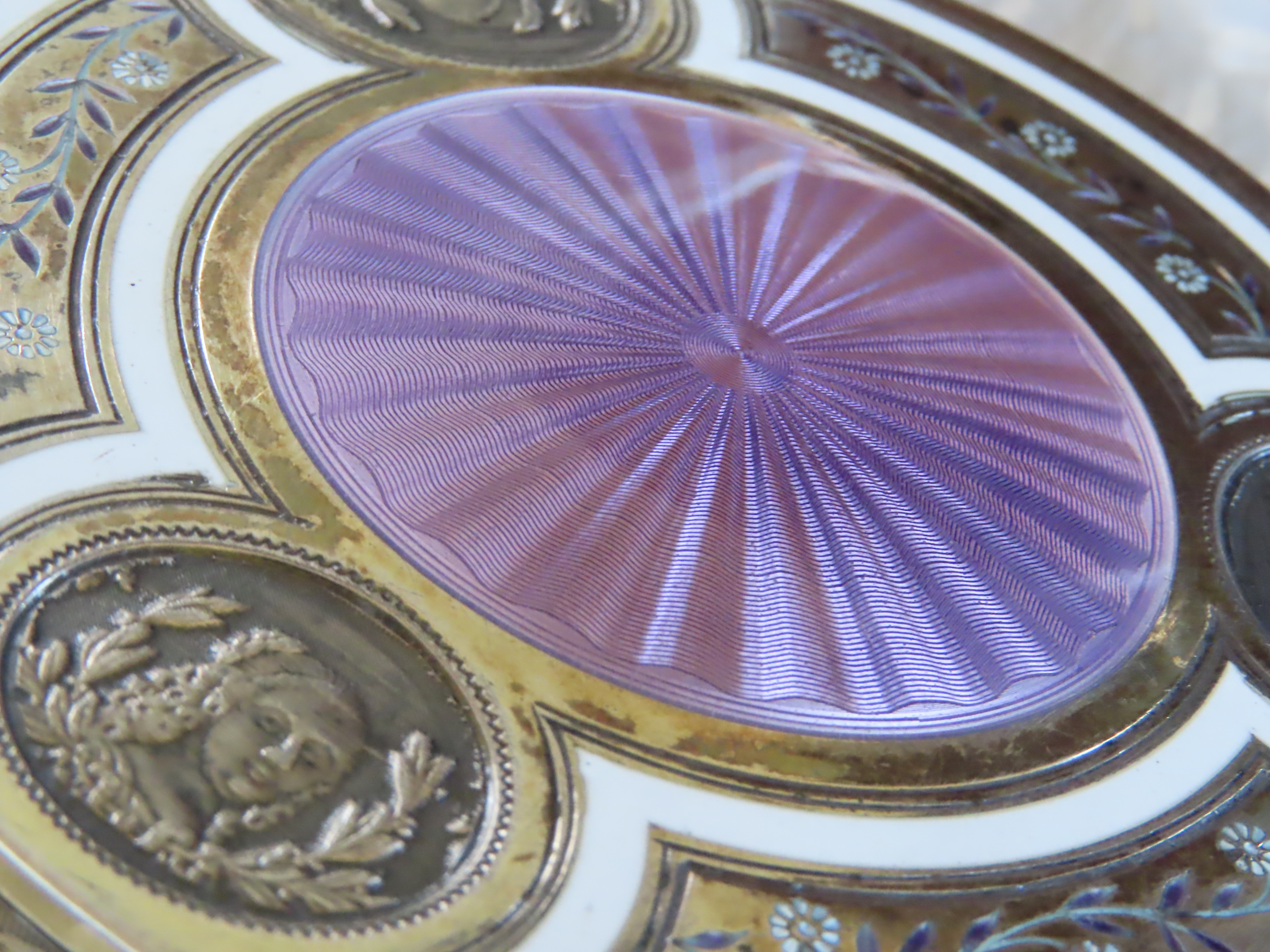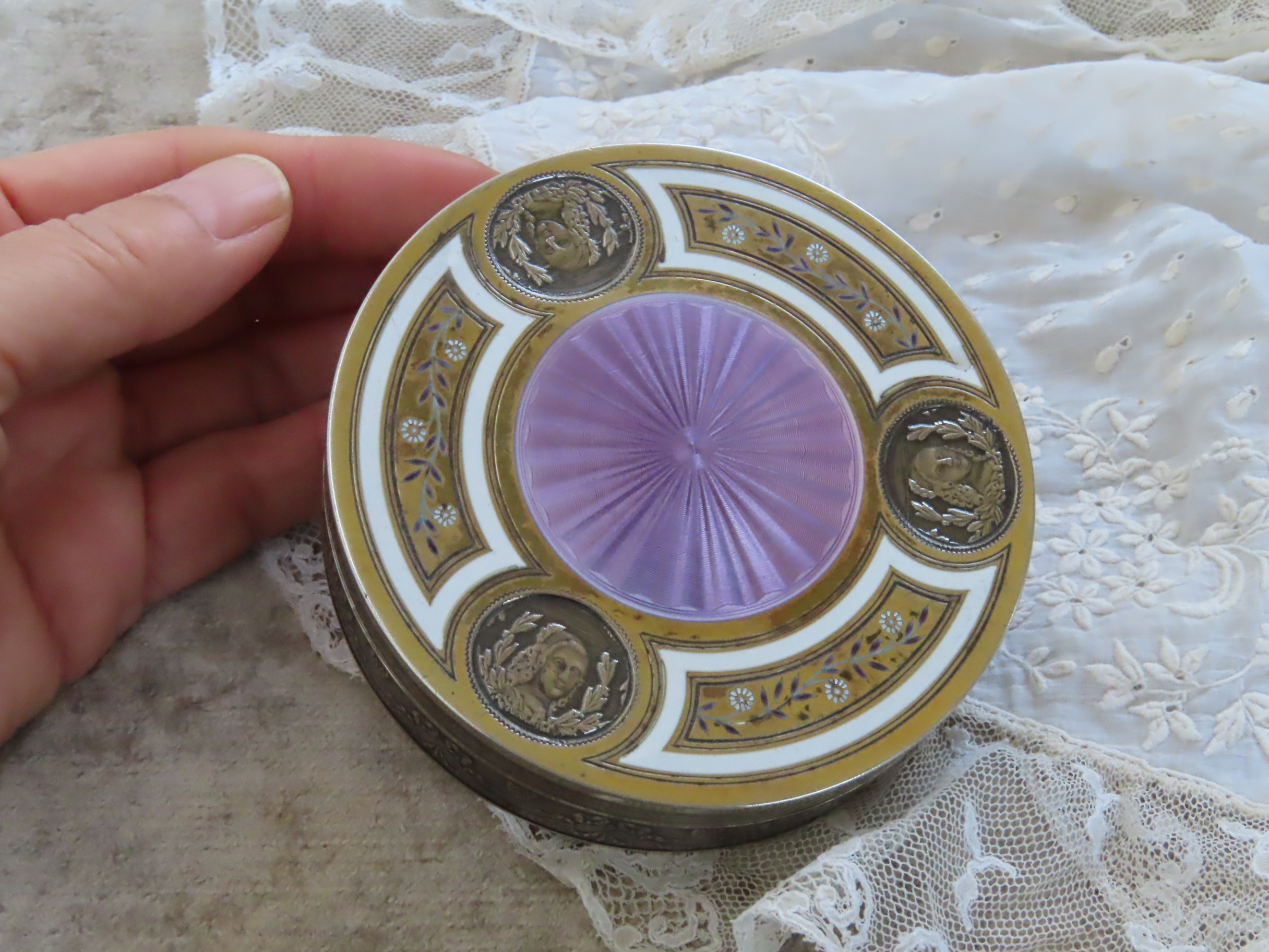 | 19世紀末フランス製の、銀にヴェルメールとエナメルの箱です。 中央のリラ色は、エンジンターンが施された上にエナメルが施された、ギロッシュエナメル。 周りの白いところもエナメル。 その中のヴェルメールの上の小花模様もエナメルです。 周りには女性のメダリオンが装飾されており、私の想像では、白粉入れではなかったかと思います。 |