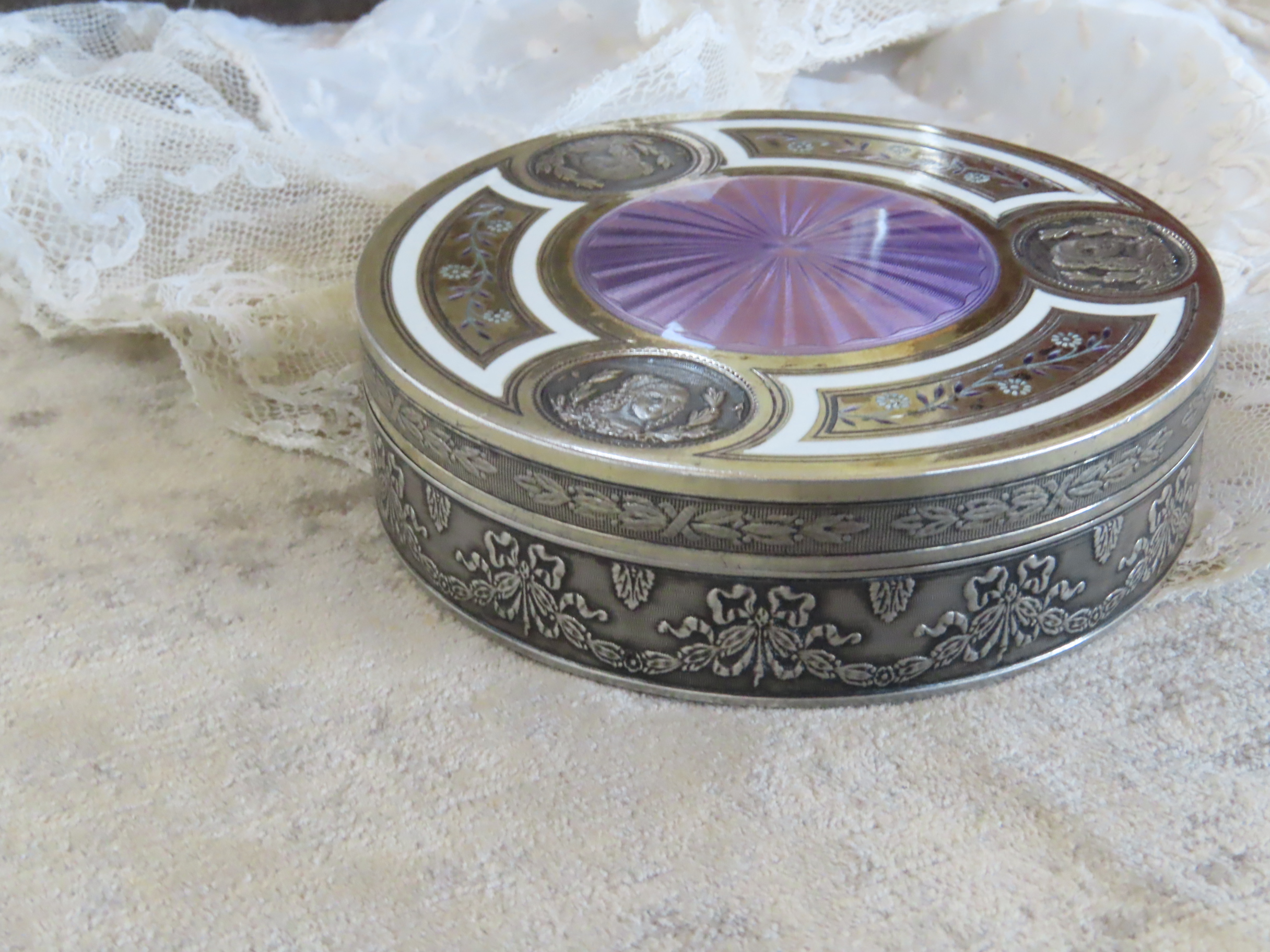 | 側面には、この時代らしいリボンのガーランド模様。 銀とヴェルメールと、エナメルのリラ色と白の対比に、とても品格がありますね! ※カーソルを画像に置きますと、違う角度の写真がご覧になれます。 |