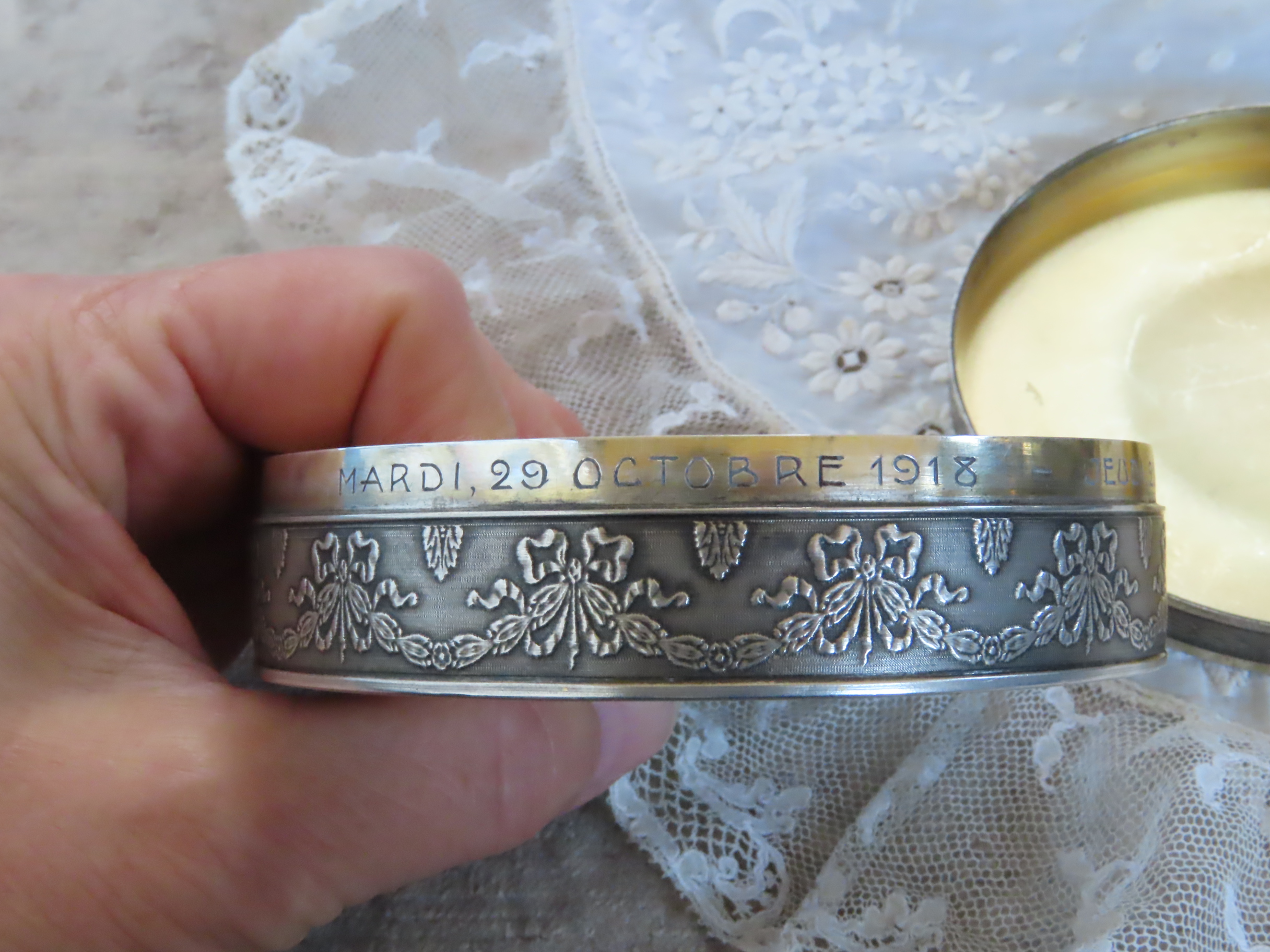 | 上:Mardi 29 Octobre 1918 Jeudi 21 Novembre 1918 と、彫ってあります。さぁ〜? 「婚約日」と「結婚日」かしら〜?*^^* 下:フランスの銀925を表す、ミネルバの刻印があります。 |