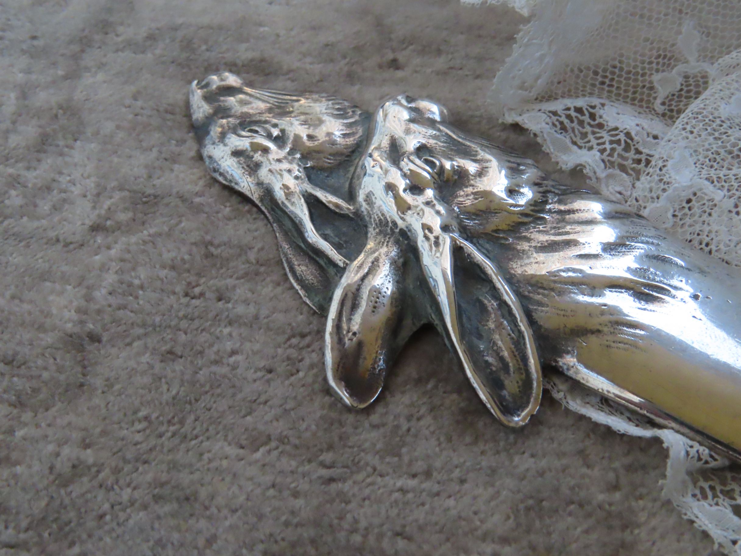 | ロシア帝国が崩壊したのが1917年ですので、革命前のお品物になります。 ロシアの冬の雪の平原を掛けていそうな精悍なお顔の兎が2匹。 古美色が美しい。 この兎の部分の長さは7.5cm、厚みは7ミリです。 |