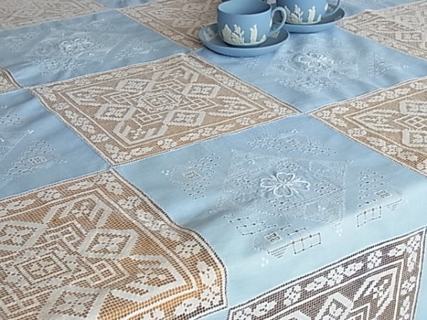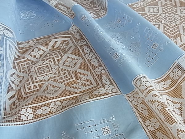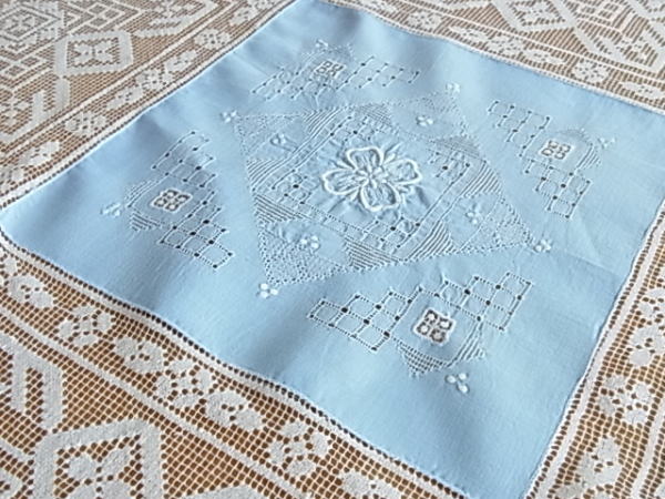 26cm角のサックスブルーのリネン地に、細かなドロンワークと白刺繍が施されたモチーフ。