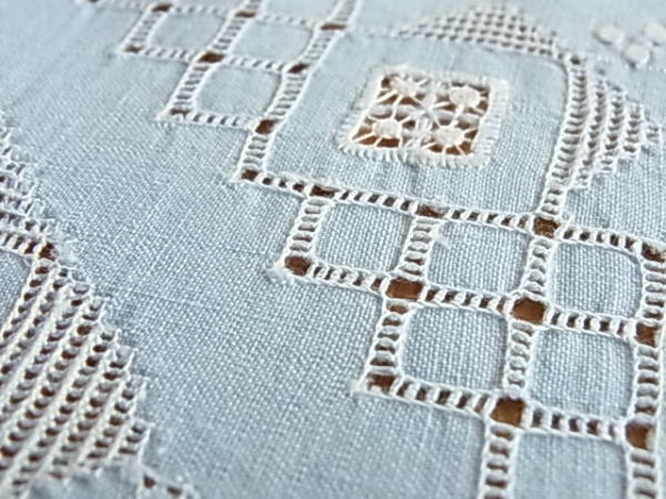 この部分写真の格子状のドロンワークの幅は、僅かに2ミリ!