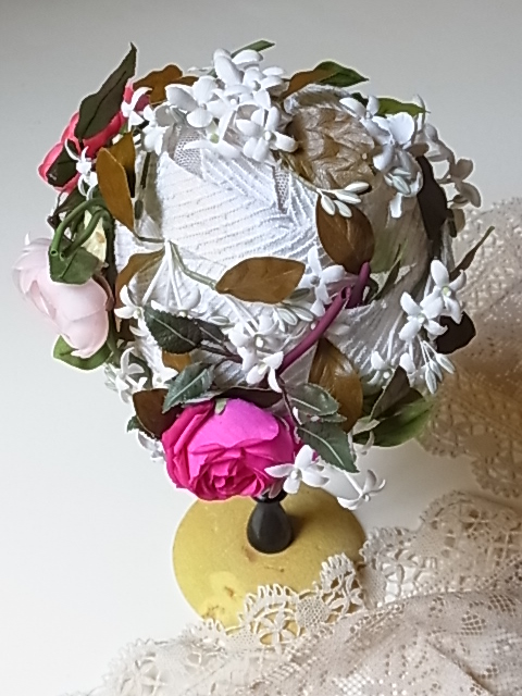 白い織りのあるリボン状の布を使い、その間に、華やかなお花が嵌め込まれています。