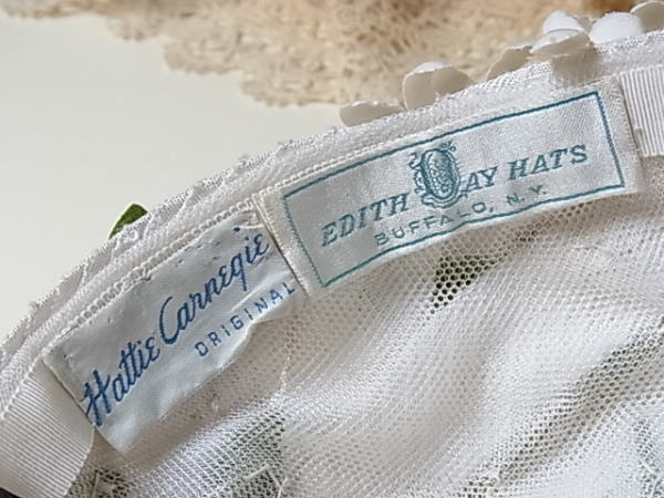 HATTIE CARNEGIEのオリジナルタグと、NY の帽子販売店のタグ.。