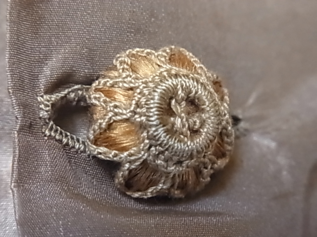 | このドレスの為に作られた、ハンドメイドのボタンです。 絹の糸を巻いて、その上にかぎ棒編みで装飾されています。 直径は、1.8cm。 |