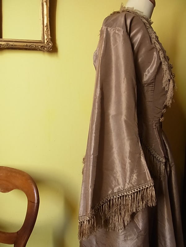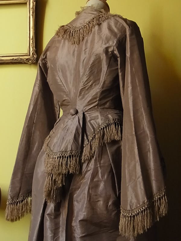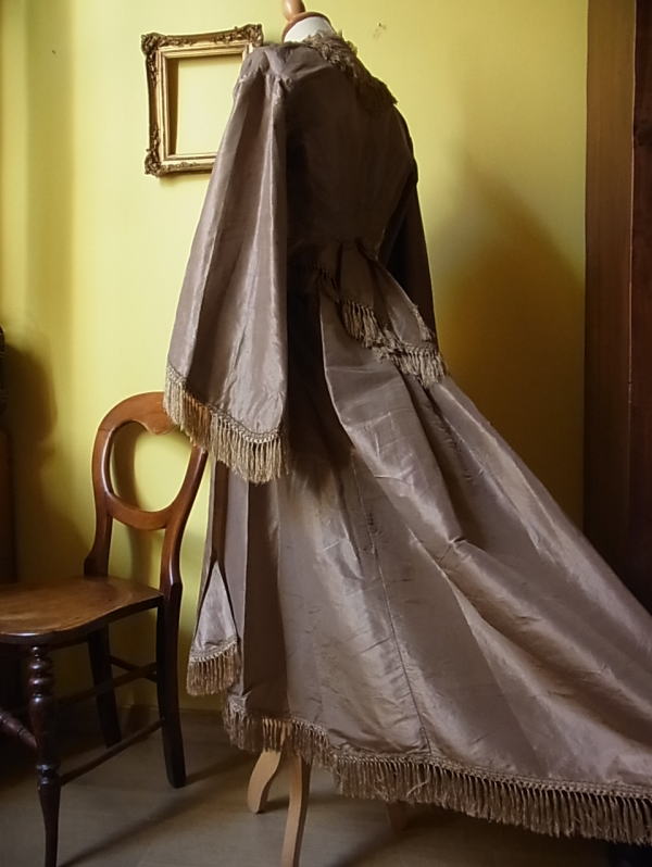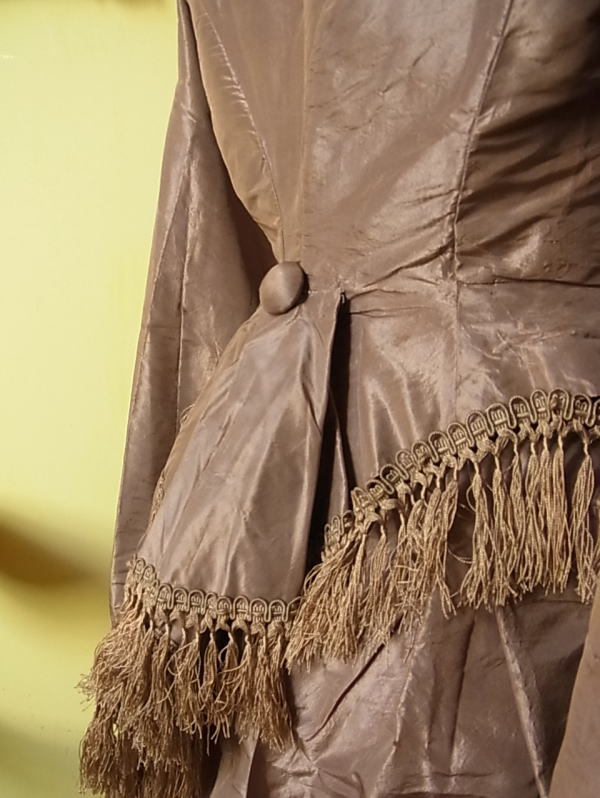 | 1860年頃の貴婦人のドレス。 シルクのジャケットとアッパースカートです。 写真では、ややくすんで写ってしまっていますが、実際はシルクの艶も麗しい、こっくりとしたモカブラウン。 まずこの素材とお色に心惹かれます。 そして、この時代を特徴つけるのはこのお袖。 このロシアン袖は、1860年頃の最新流行。 当時のファッション画によると(下記参照)、この下にふわりとしたブラウスを着用したようです。 |