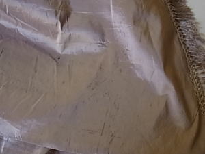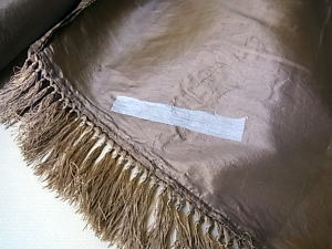 | 裏側から、シルクの切れを保護するためのテープが、複数個所付いています。 スカートにひとつ小穴があります。 経年による薄い茶色のしみがあります。 |