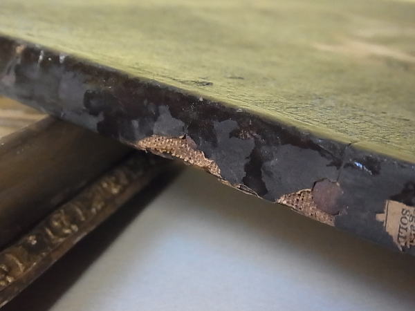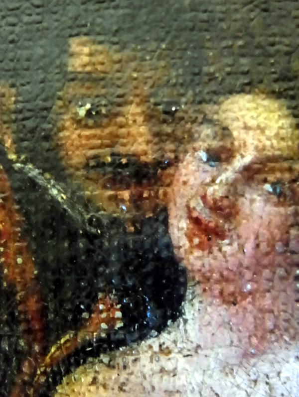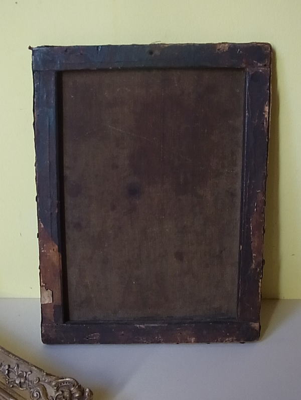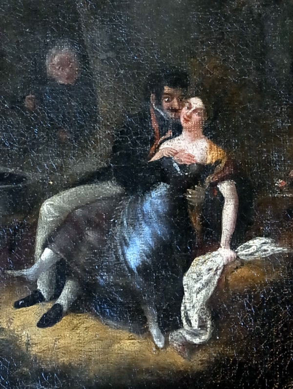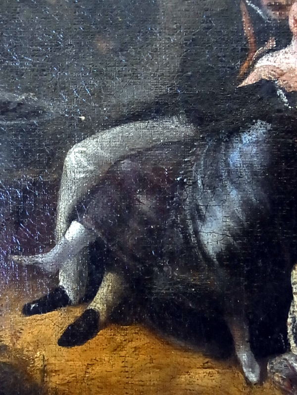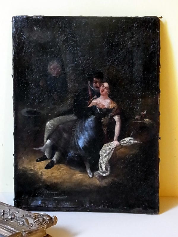 | 絵画修復家の友人に見てもらいましたが、キャンバス地は、17世紀のものとのことです。 この下に違う絵画が描かれている可能性があるかも、、、とのことでした。 時代は、描かれている二人の衣装から推測しています。 風俗画は、その当時の服飾で描かれたからです。 |