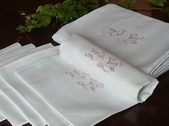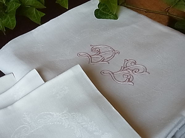 | 赤い縁取りのDLのイニシャルがキュートな、ダマスクリネンのテーブルクロス&ナプキンのセットです。 大変に良好なコンディション。 ※カーソルを画像に置きますと、拡大写真がご覧になれます。 |