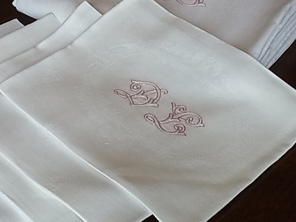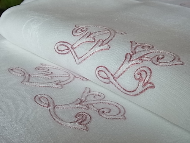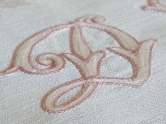 | テーブルクロスにも、ナプキンにも、全て同じ大きさのチェーンステッチのイニシャルが刺繡されています。 ※カーソルを画像に置きますと、拡大写真がご覧になれます。 |