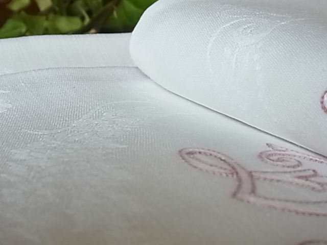 | しっかりとして艶やかな、ダマスクリネン。 お色は、オフホワイトです。 すがすがしい清潔感が、溢れています。 |