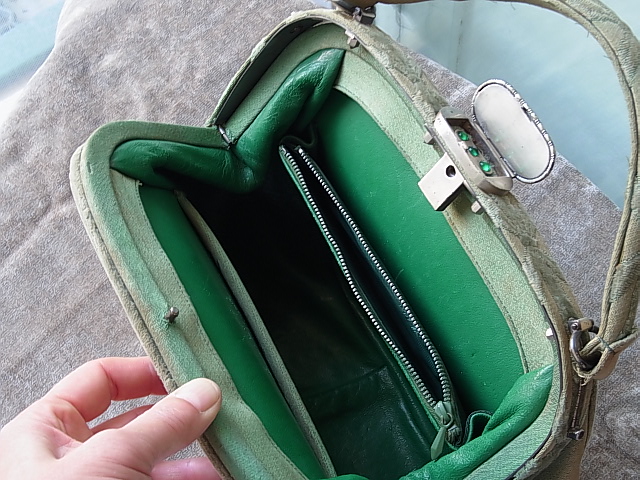 内側は、華やかな緑色の本革張り。