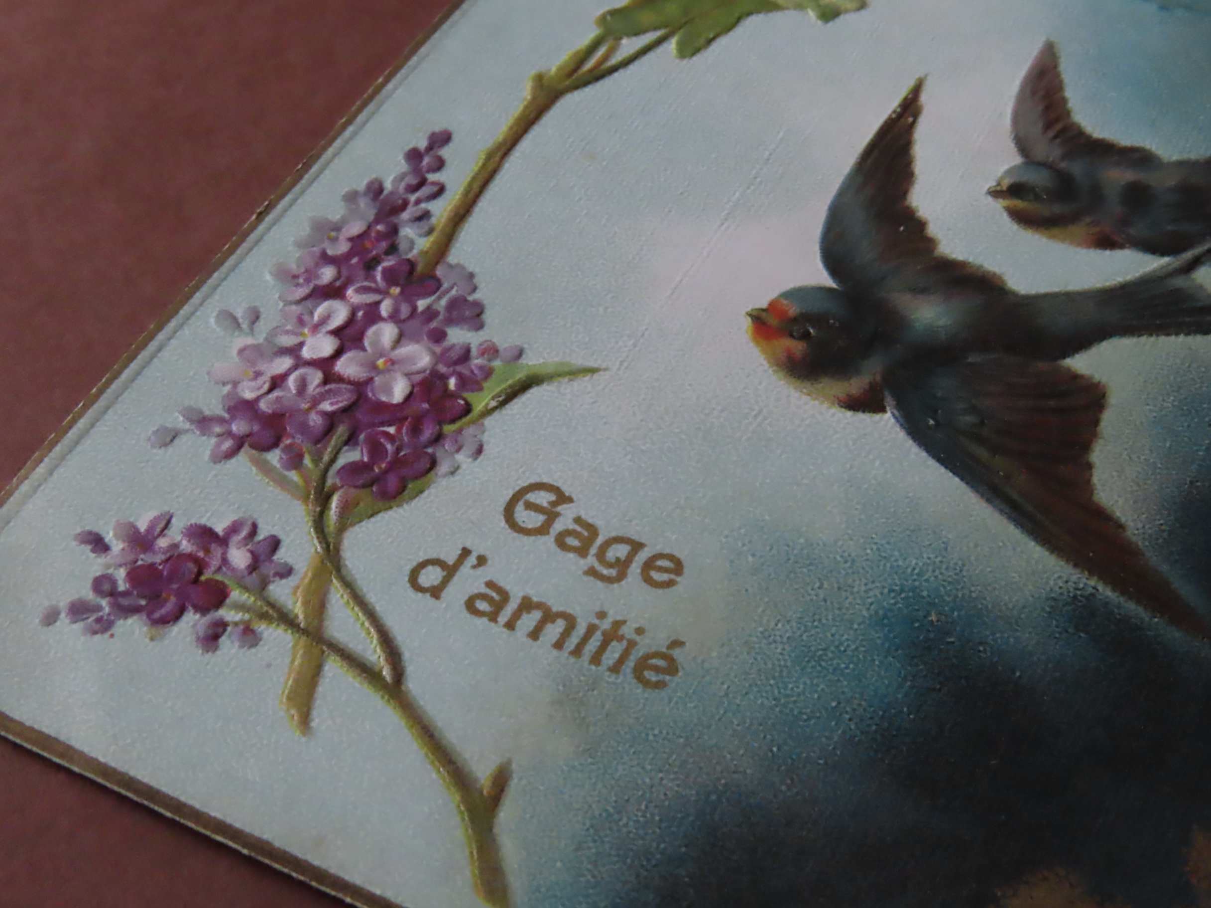 | 19世紀末から20世紀初頭の、フランスのポストカードです。 フランス人が大好きなリラの花。 Gage d'amitié=友情の誓い。 |