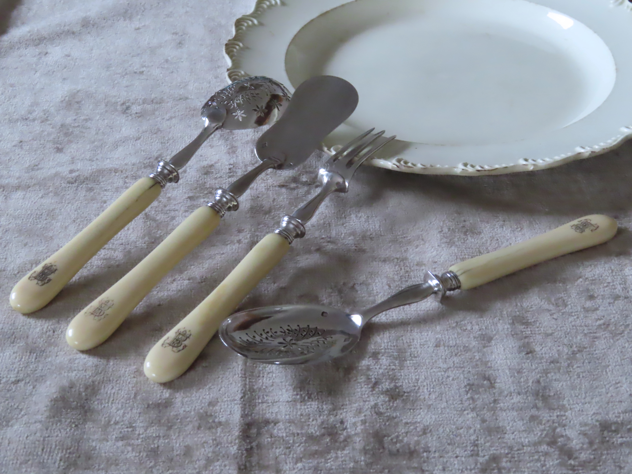 麗しき19世紀、古のフランスの銀と象牙のカトラリー。