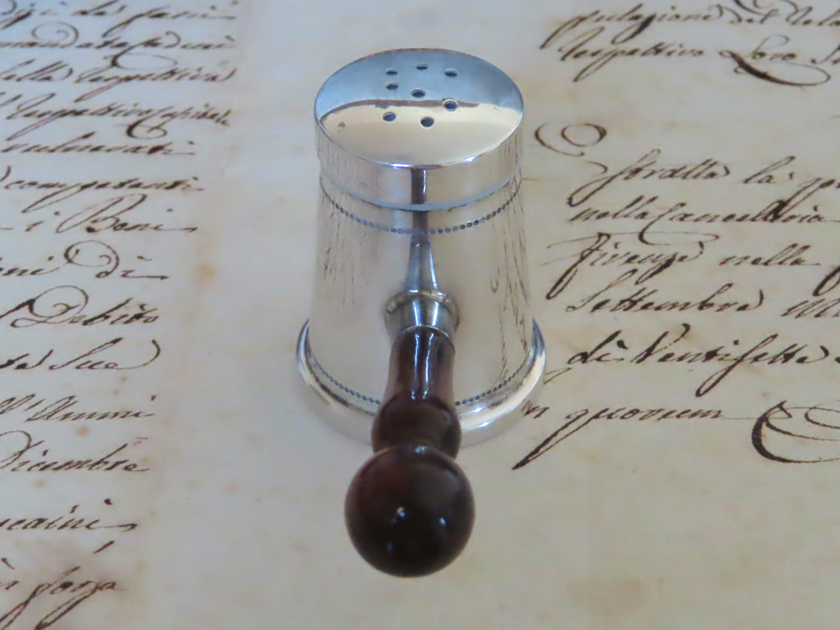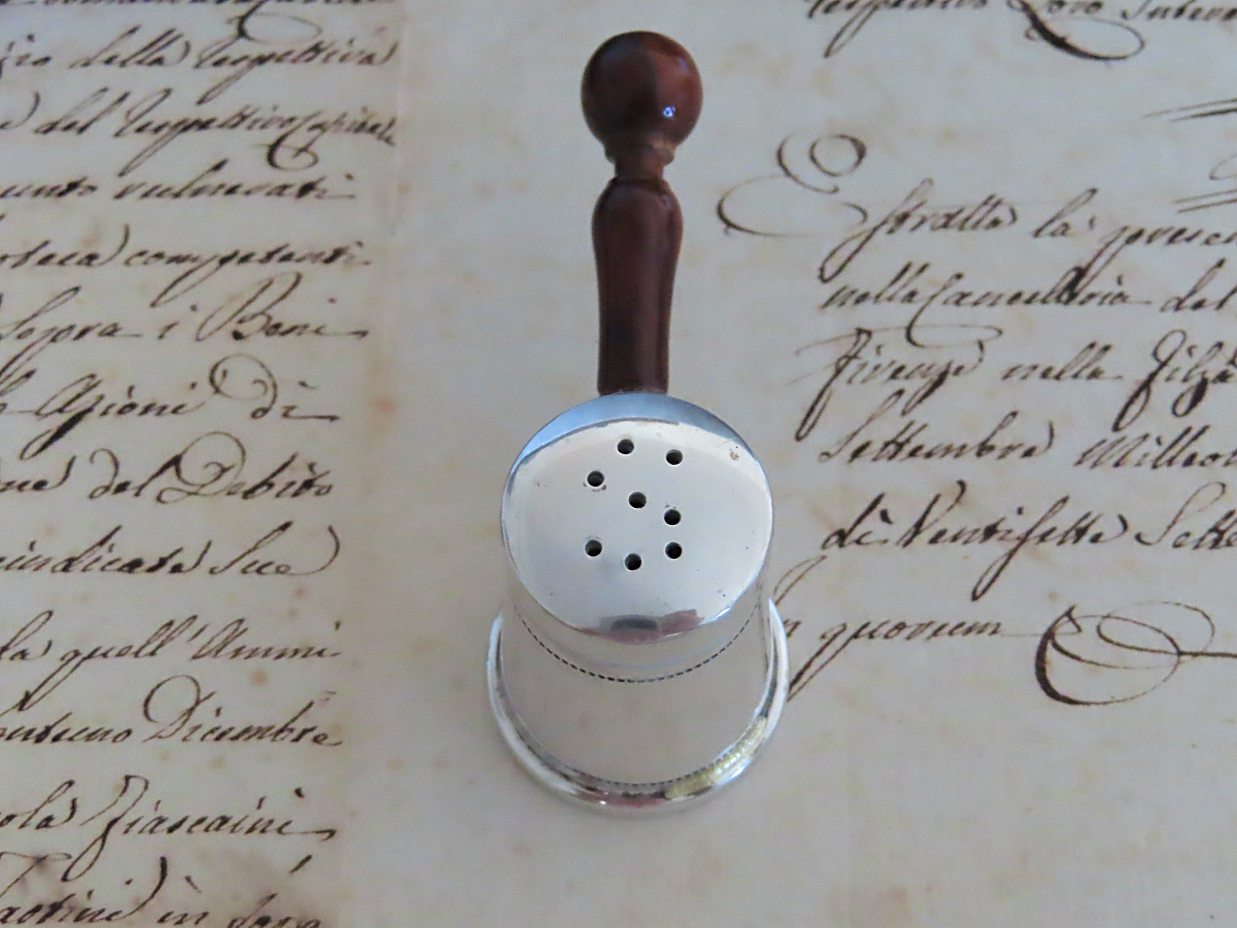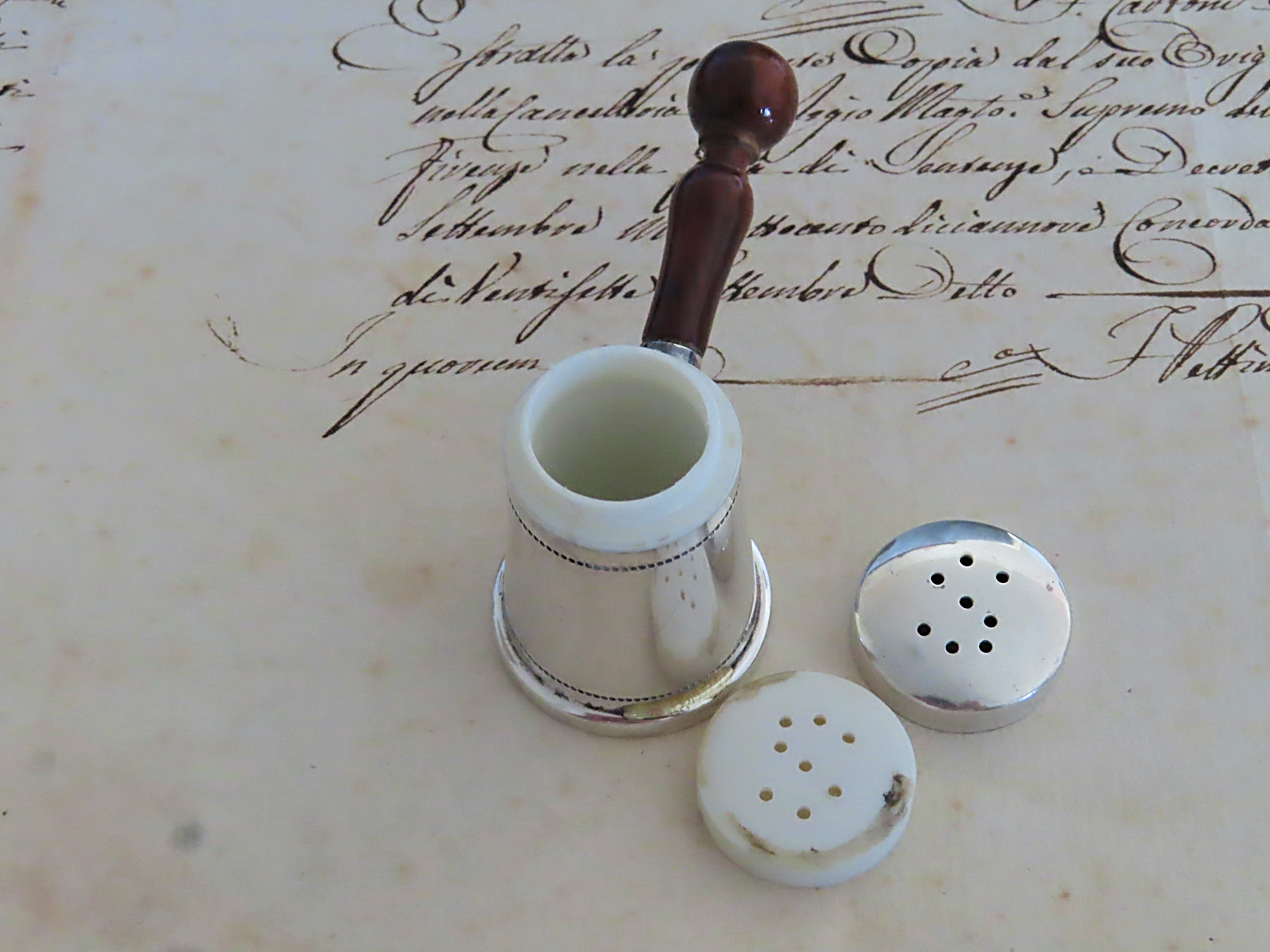 1960年代と思われる、銀800と木材の塩入れ。イタリア製。